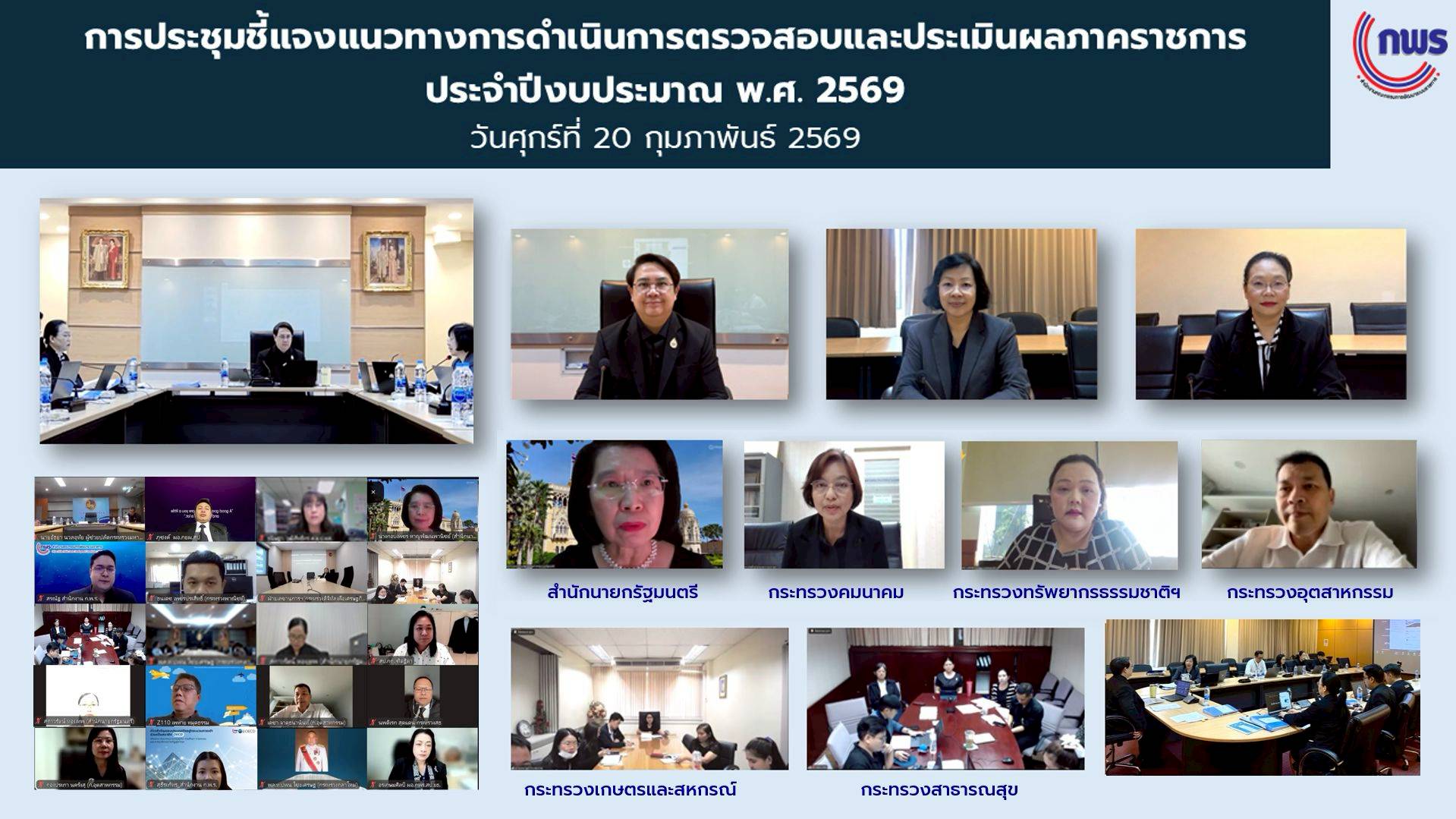 เมื่อวันที่ 20 กุมภาพันธ์ 2569 สำนักงาน ก.พ.ร. จัดการประชุมชี้แจงแนวทางการดำเนินการตรวจสอบและประเมินผลภาคราชการ ประจำปีงบประมาณ พ.ศ. 2569 ผ่านสื่ออิเล็กทรอนิกส์ โดยมีนางสาวณฐิณี สงกุมาร รองเลขาธิการ ก.พ.ร. เป็นประธานกล่าวเปิดการประชุม และนางสาวนิชา สาทรกิจ ผู้อำนวยการกองติดตาม ตรวจสอบ และประเมินผลภาคราชการ เป็นผู้ชี้แจงแนวทางการตรวจสอบและประเมินผลภาคราชการฯ และร่างระเบียบสำนักนายกรัฐมนตรี ว่าด้วยการตรวจสอบและประเมินผลภาคราชการ พ.ศ. ....